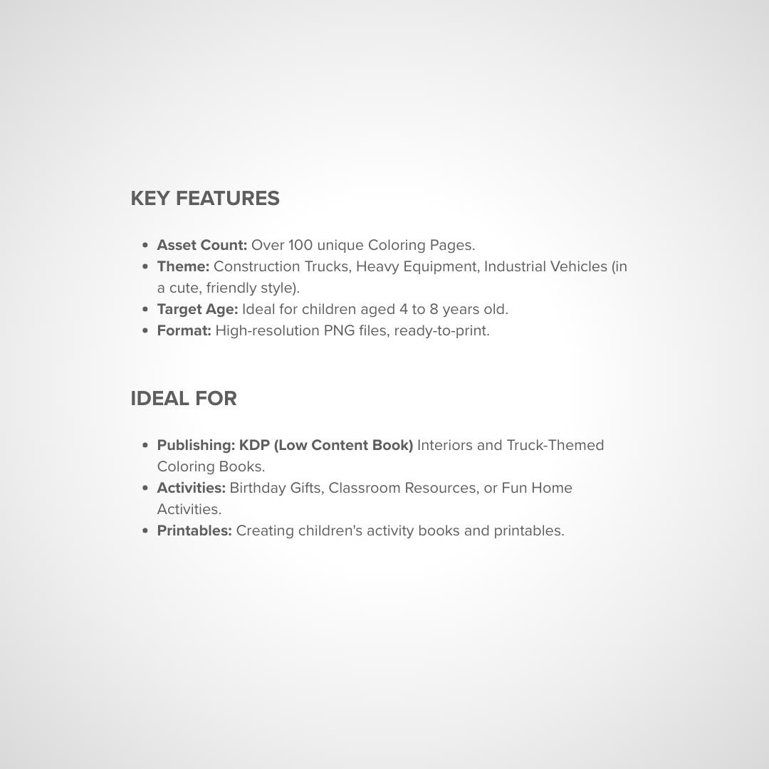 Publishing: KDP (Low Content Book) Interiors and Truck-Themed Coloring Books.