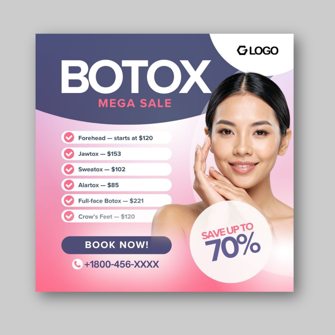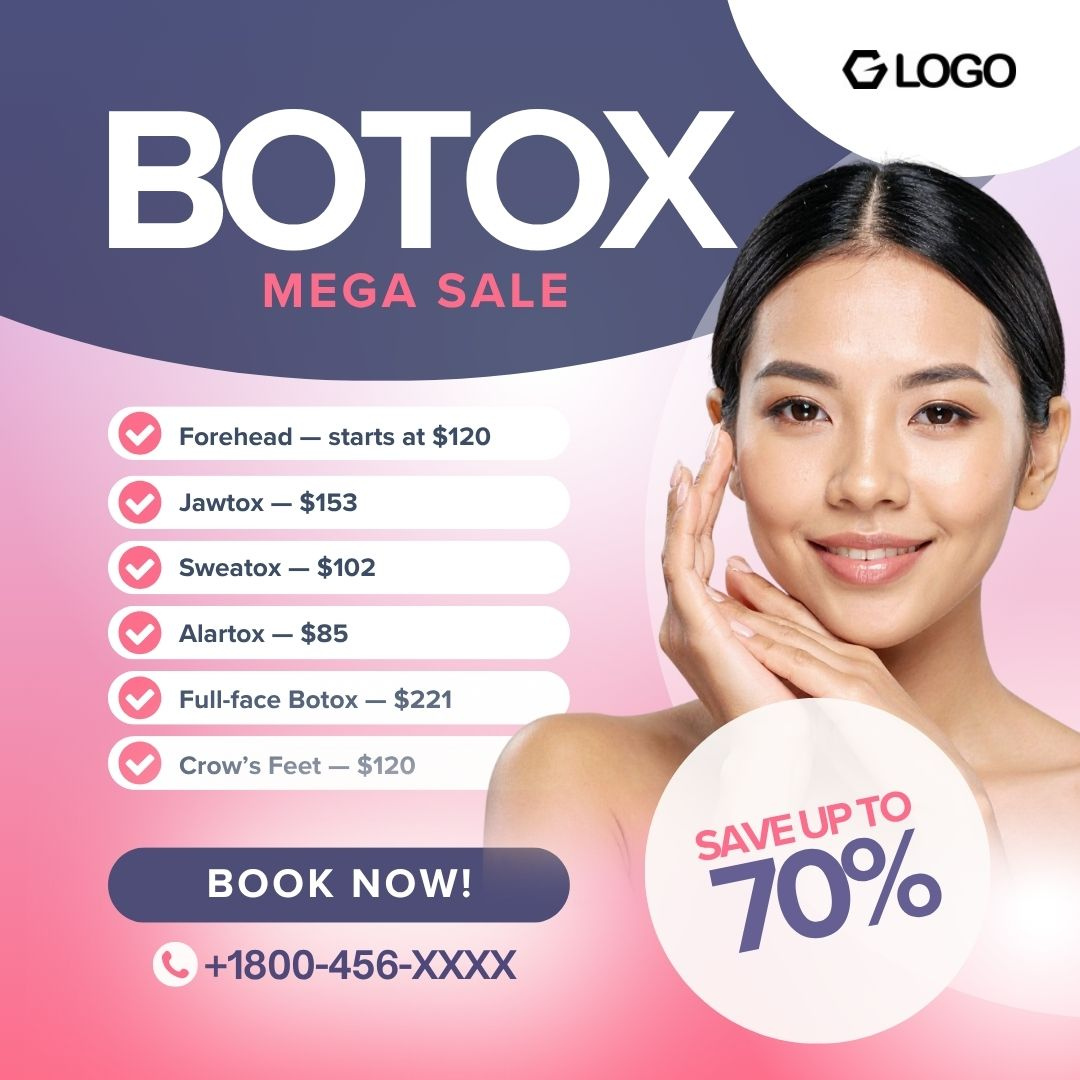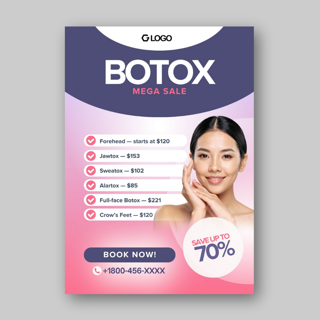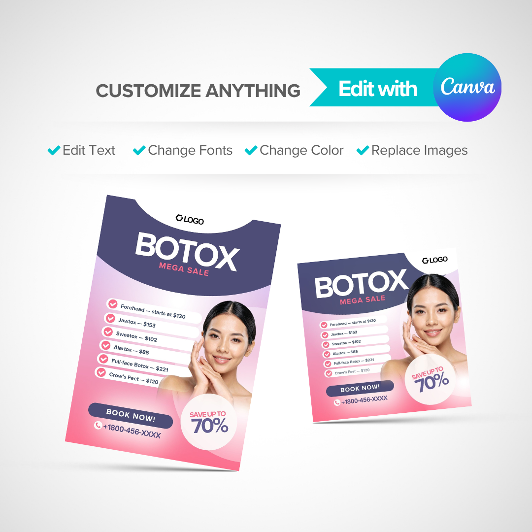 Promote your clinic’s Botox offers with this eye-catching modern Canva template. Perfect for online campaigns and print flyers.
