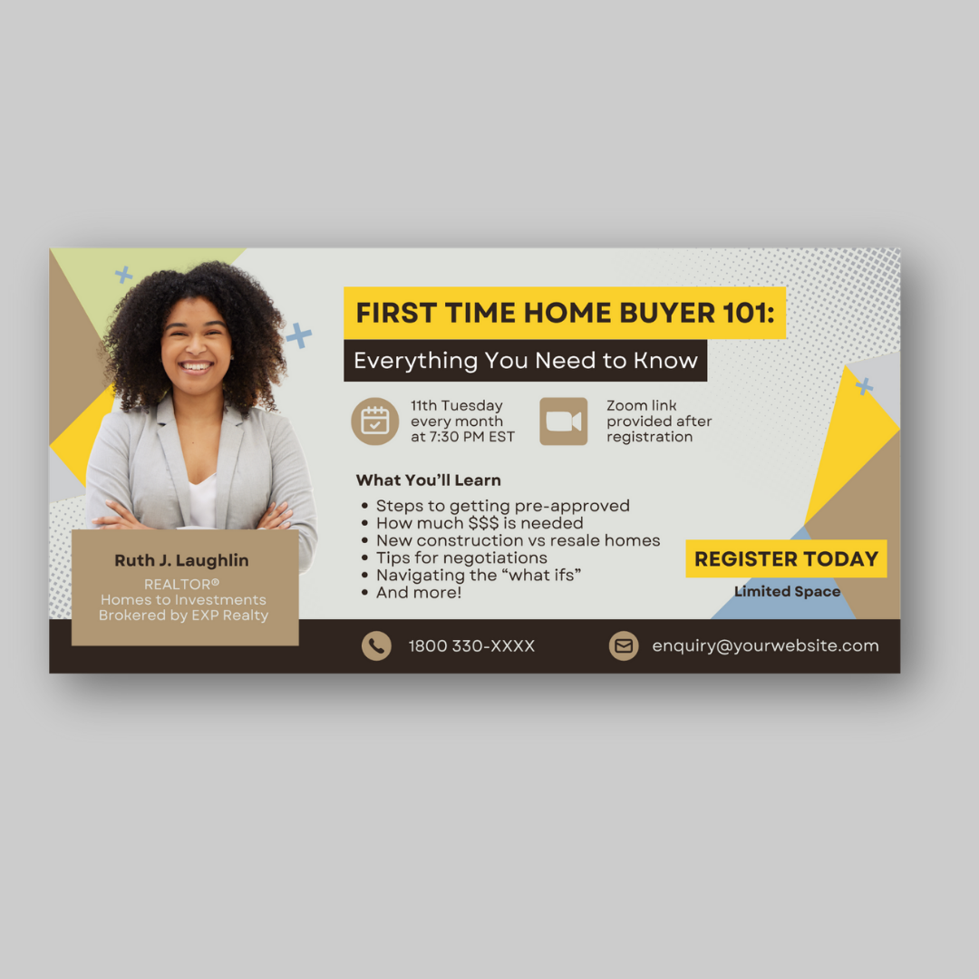 Engage and educate potential homebuyers with this editable Canva template set. Ideal for real estate professionals and agencies hosting virtual homebuyer workshops or in-person property events.