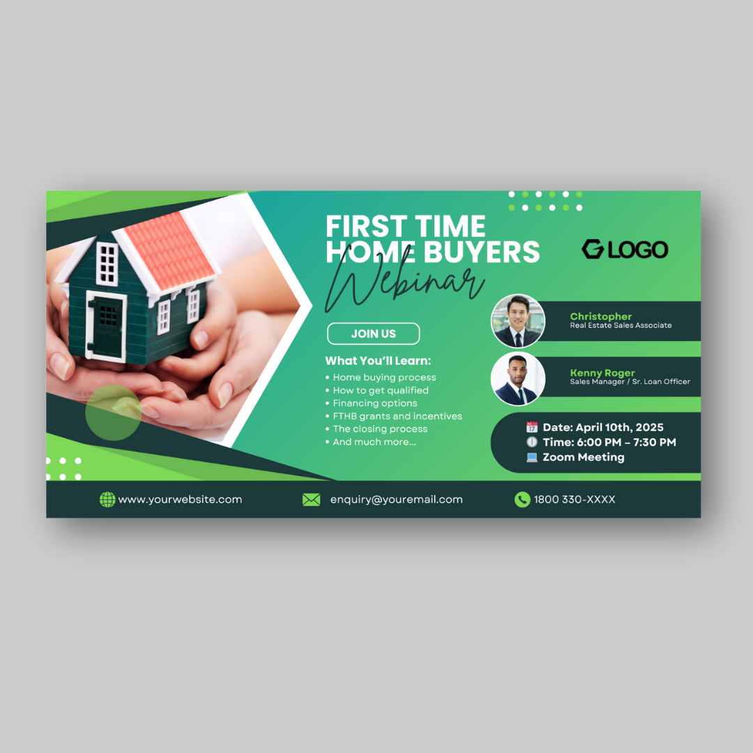 Promote your real estate webinar or homebuyer info session with this modern Canva template set. Designed for real estate professionals to connect with potential buyers and educate them on the buying process.