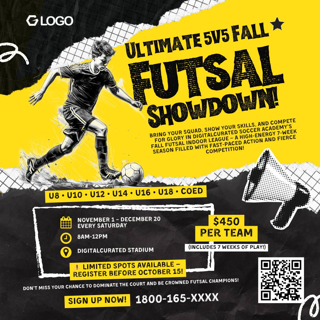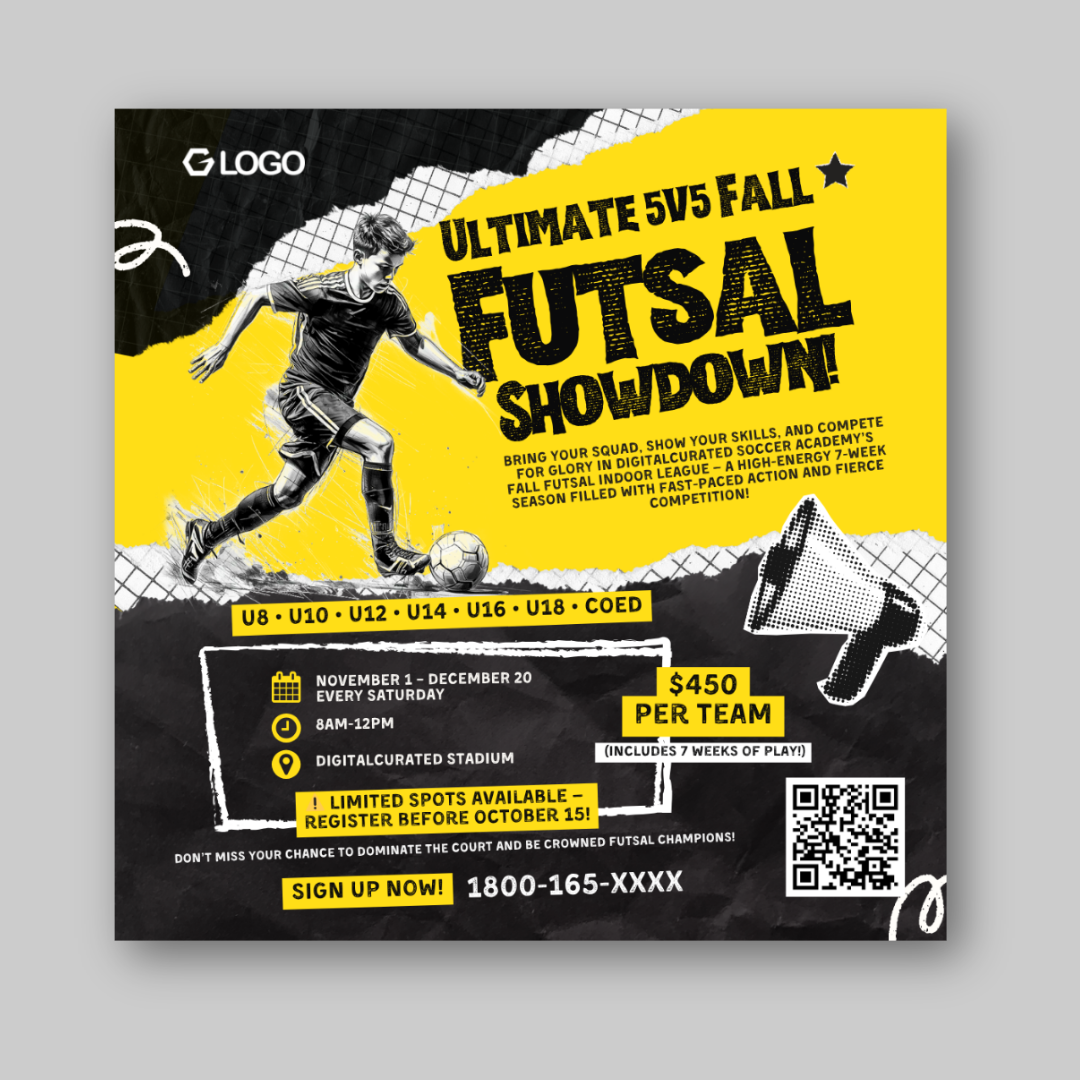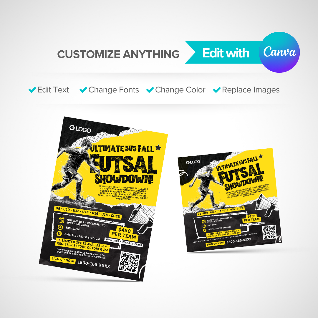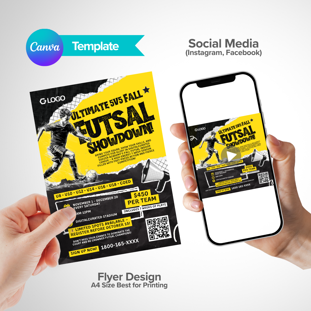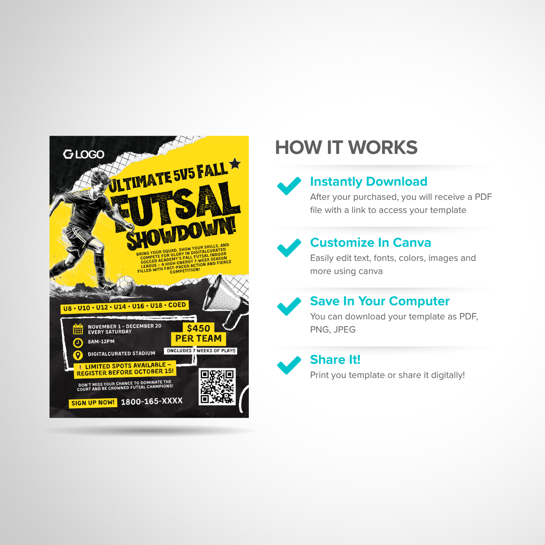 Promote your futsal or indoor soccer tournament with this powerful Canva template.