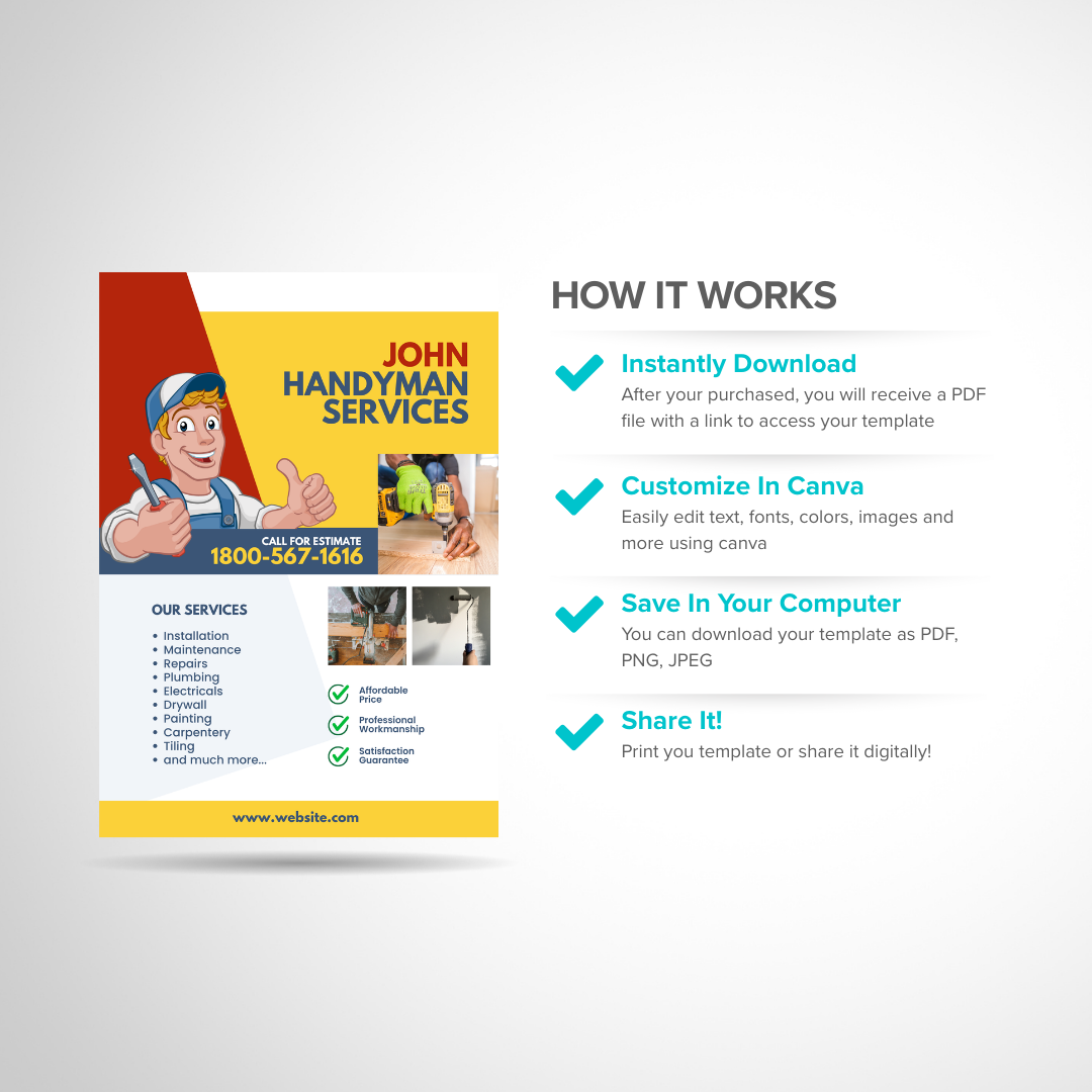 Use this contractor flyer template to advertise your services such as installation, repairs, plumbing, electricals, drywall, tiling, and more. Ideal for plumbers, renovation contractors, and handyman businesses looking to grow their customer base with professional marketing materials.