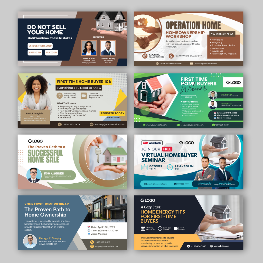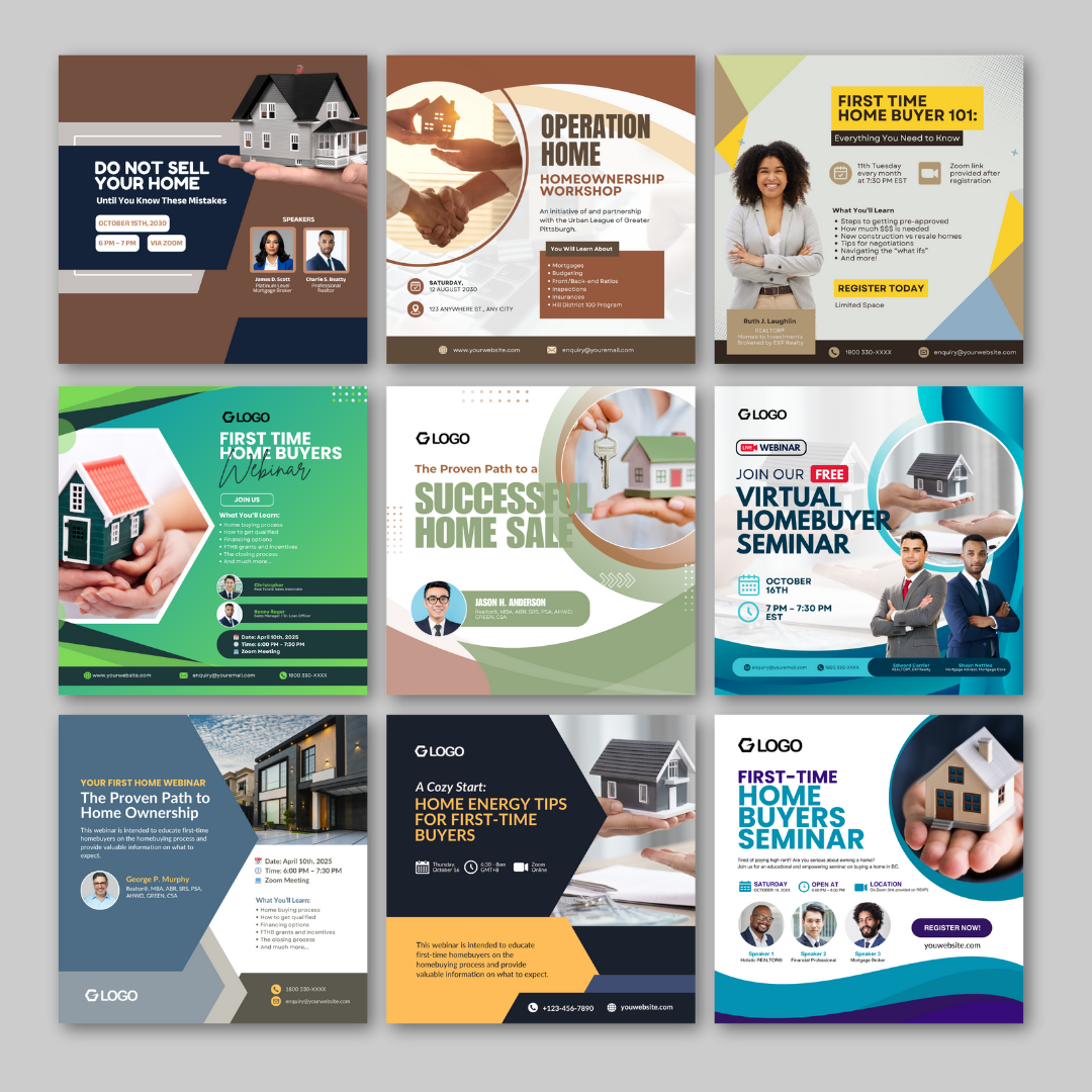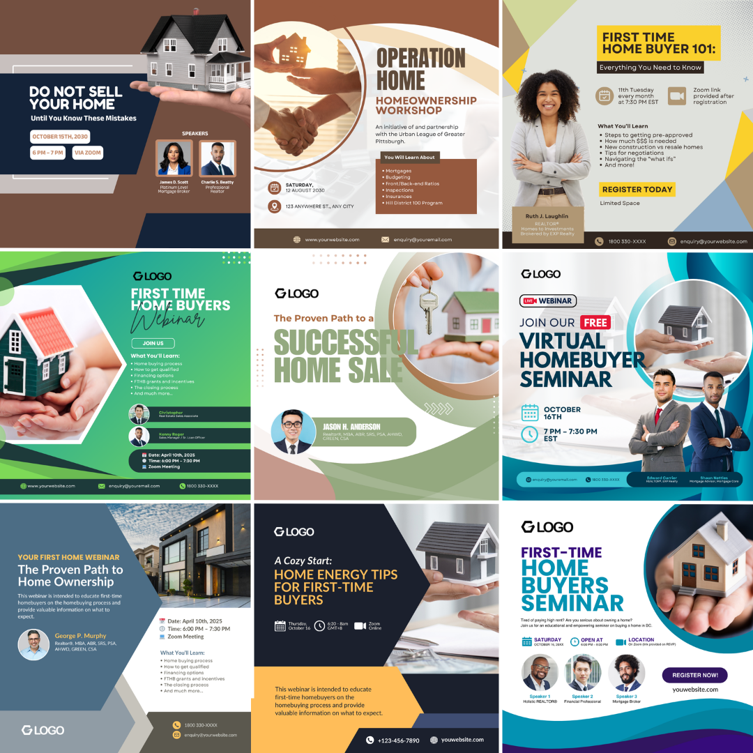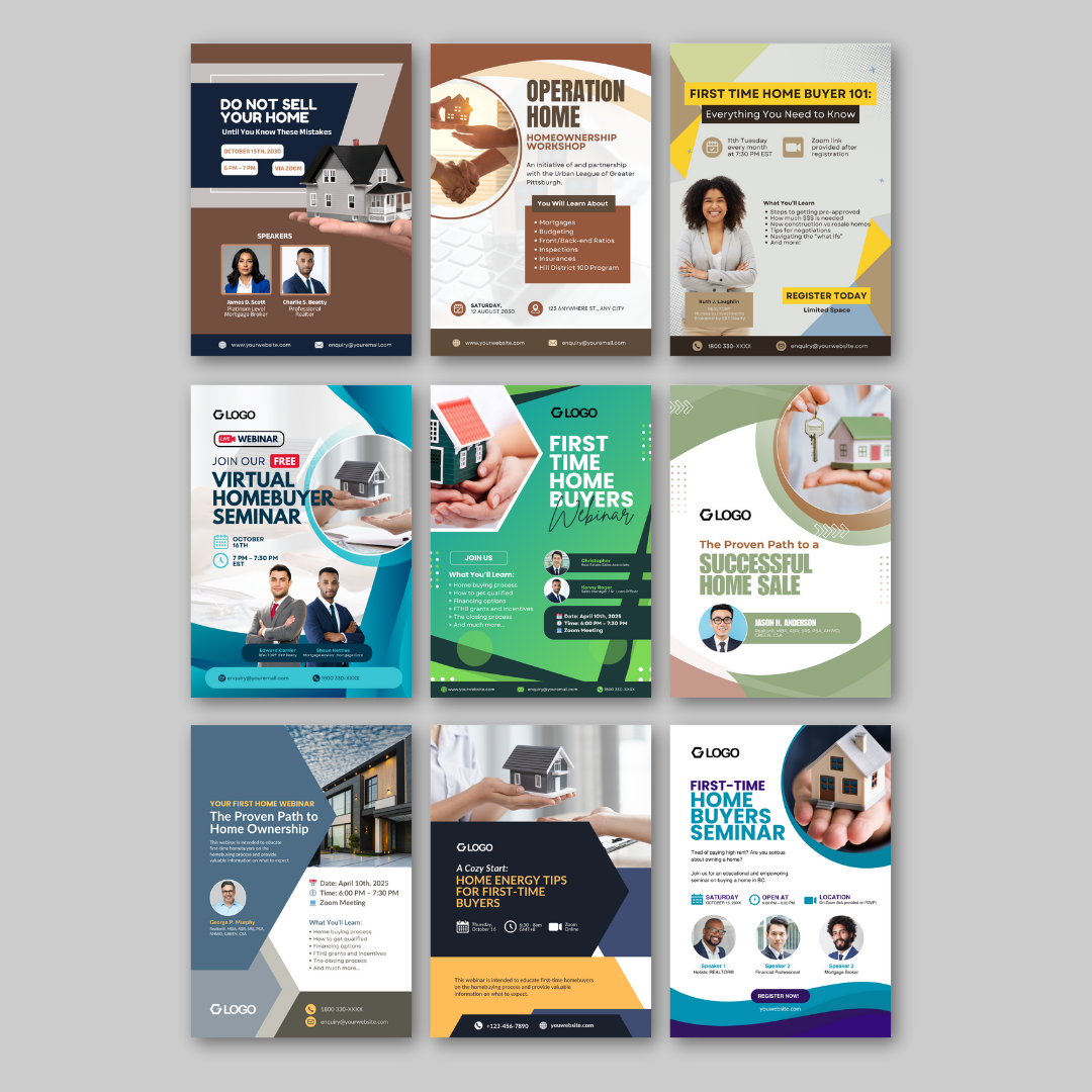 Promote your real estate seminar or homebuyer workshop with this modern, fully editable Canva template pack. Designed to attract first-time home buyers and property investors with a clean professional look.