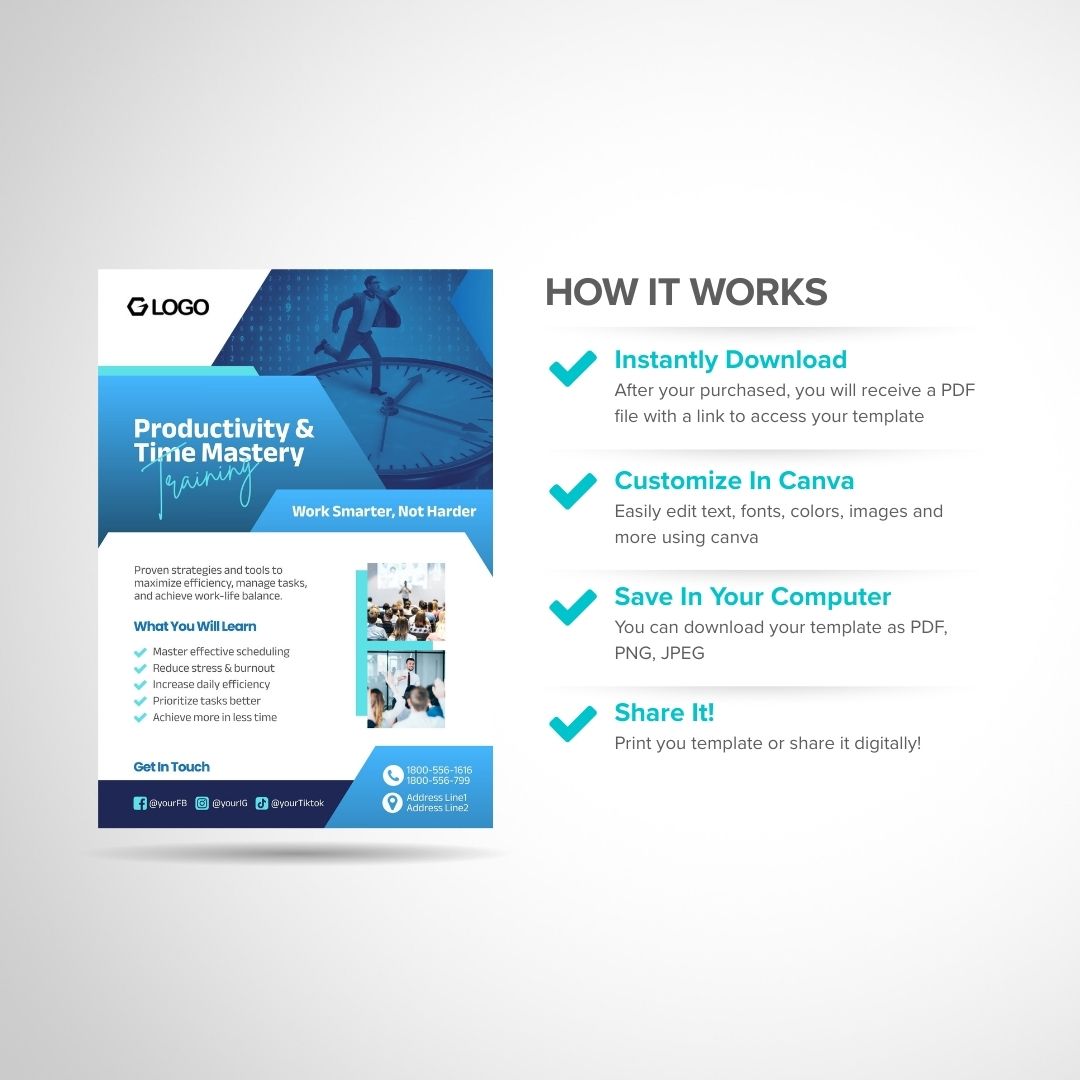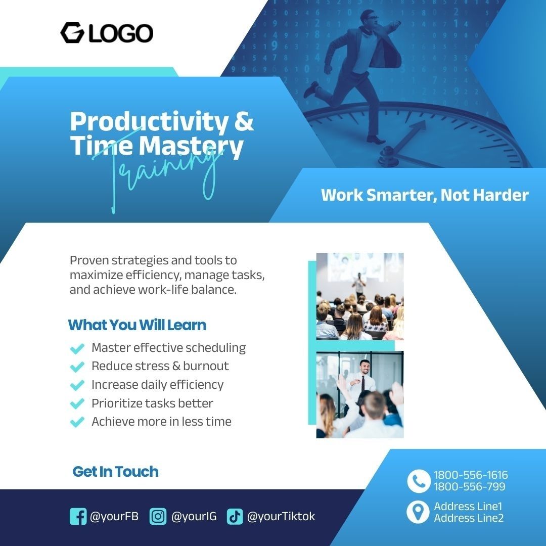 productivity training flyer template, time management workshop poster, editable canva productivity flyer, work smarter training flyer design, burnout management workshop poster, professional development flyer template, task prioritization seminar flyer, efficiency training canva flyer, corporate productivity event poster, personal growth time mastery flyer, editable canva training flyer, blue corporate seminar poster
