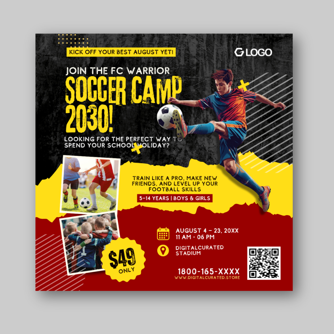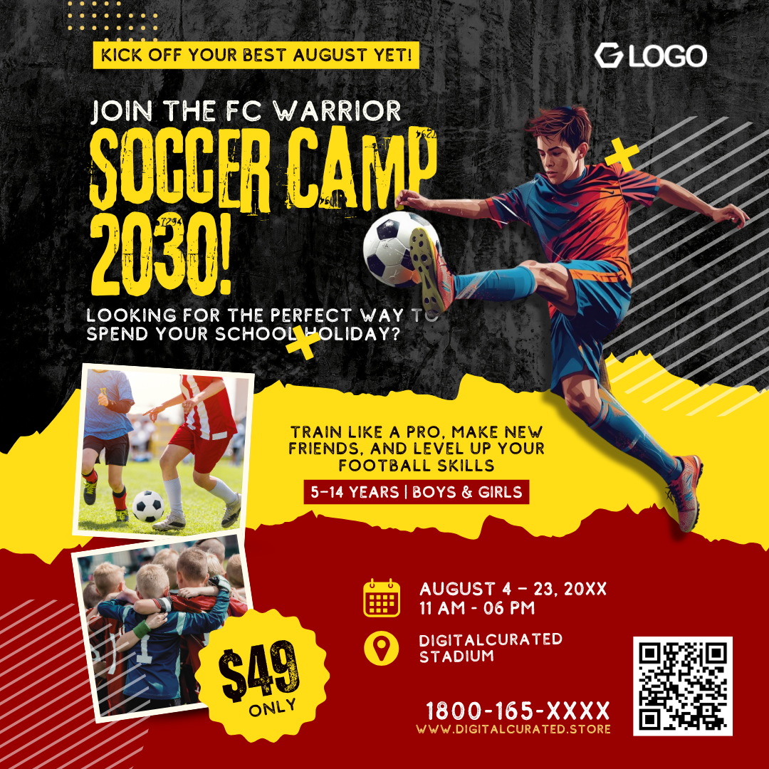 Promote your football or soccer camp with this vibrant Canva template.