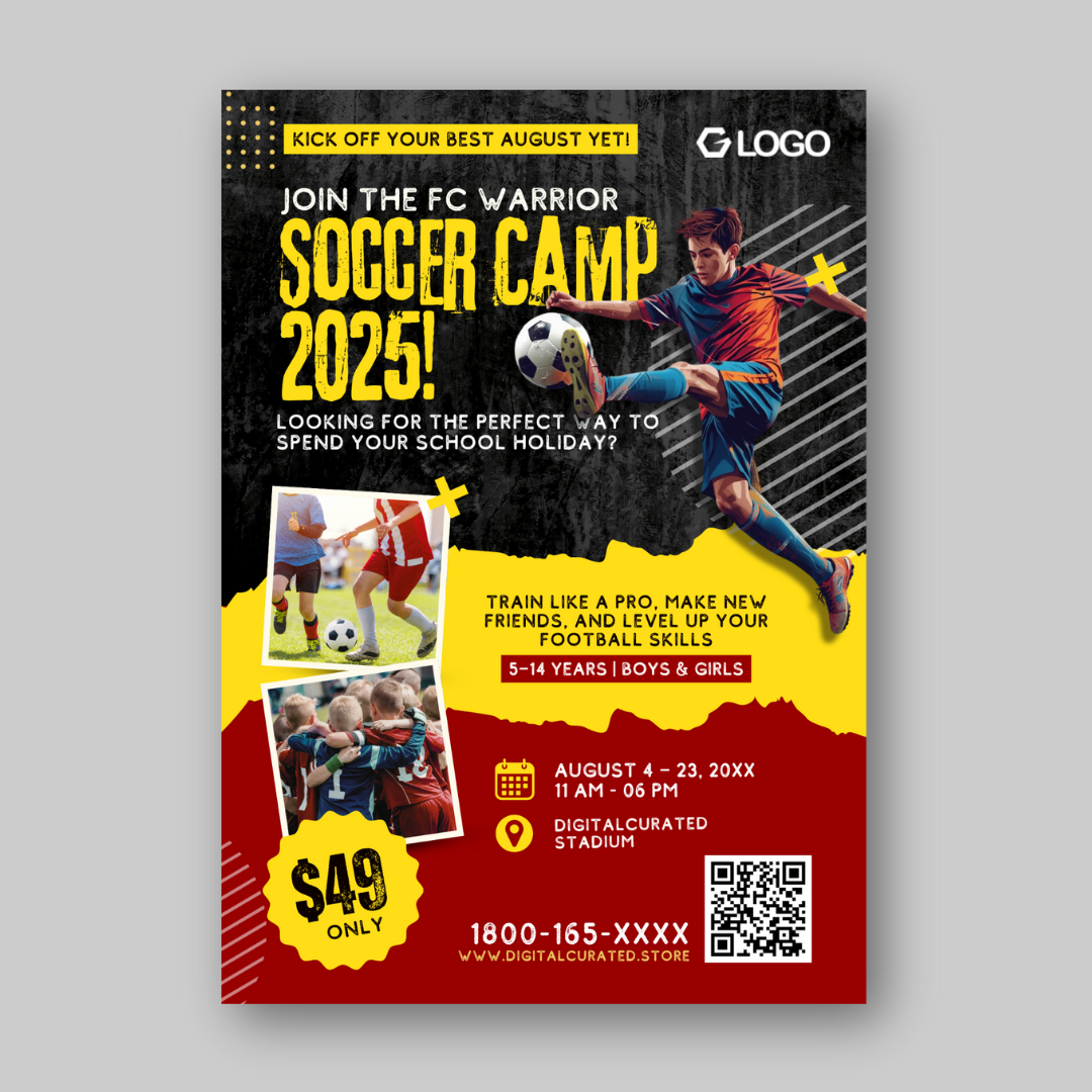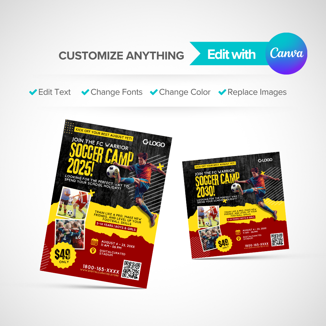soccer flyer, football camp template, canva editable sports design, youth football poster, summer soccer camp, team training flyer, football event promotion, canva sports template, sports marketing design, kids football flyer, school soccer event, soccer tournament ad, youth camp poster