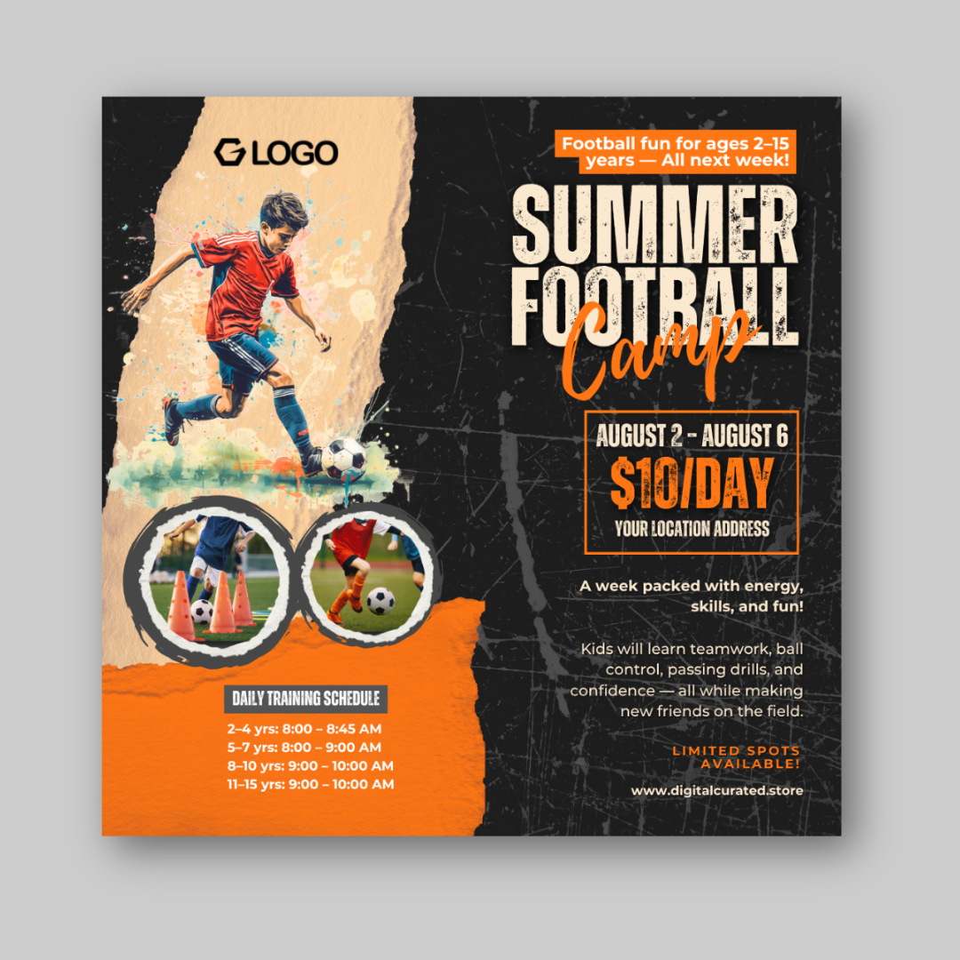 football flyer, soccer camp design, summer sports flyer, youth football training, canva editable sports template, football academy poster, sports marketing design, youth soccer event, kids football flyer, summer training ad, canva football post, soccer promotion template, sports social media design
