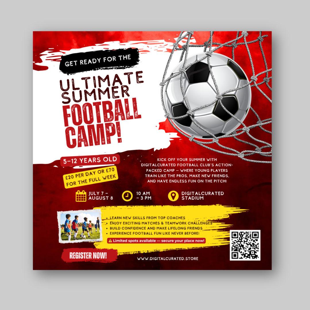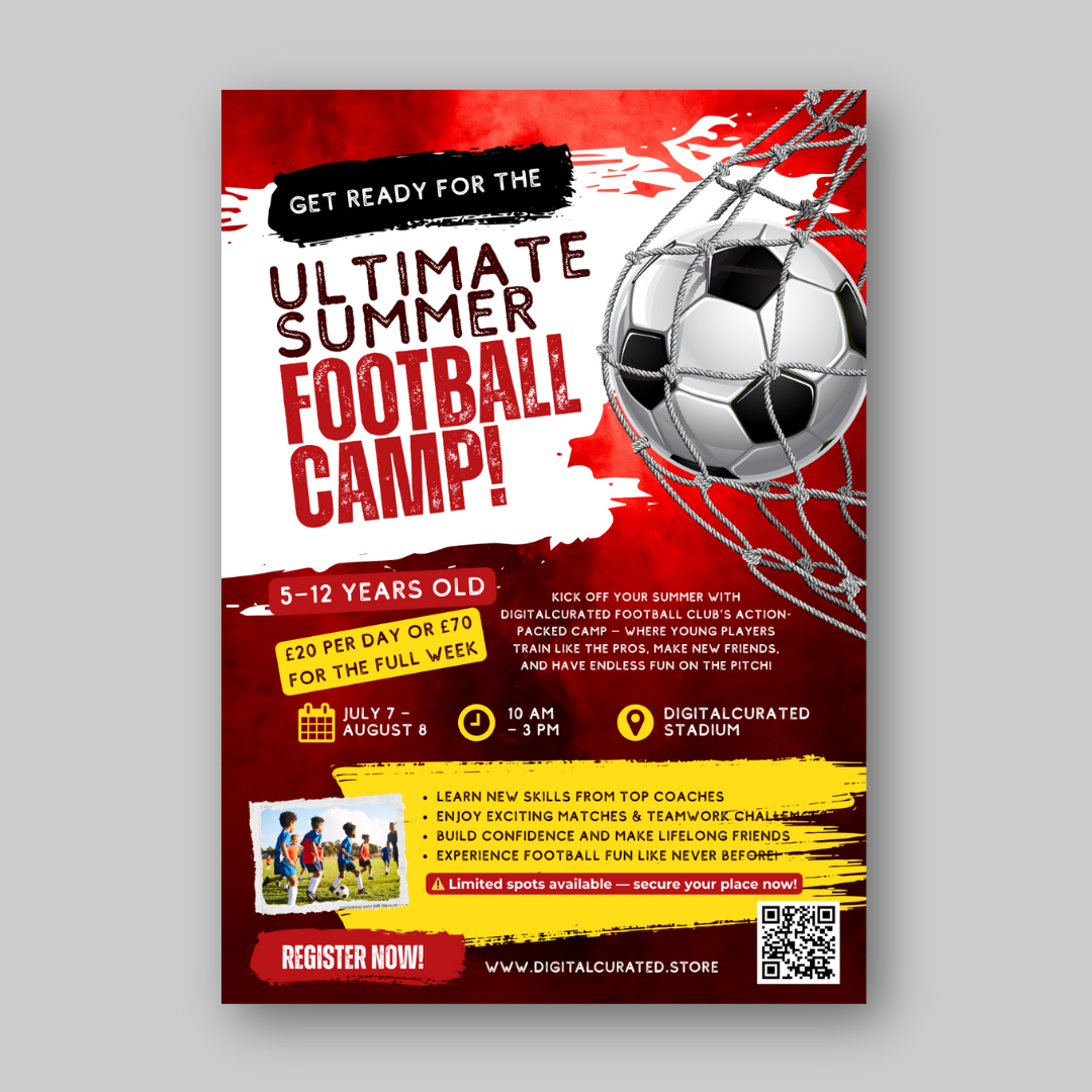 football flyer, soccer camp template, canva editable sports design, youth football training, summer soccer event, sports camp promotion, football academy flyer, canva football ad, school soccer poster, youth sports social media post, team training flyer, sports marketing design, canva summer camp