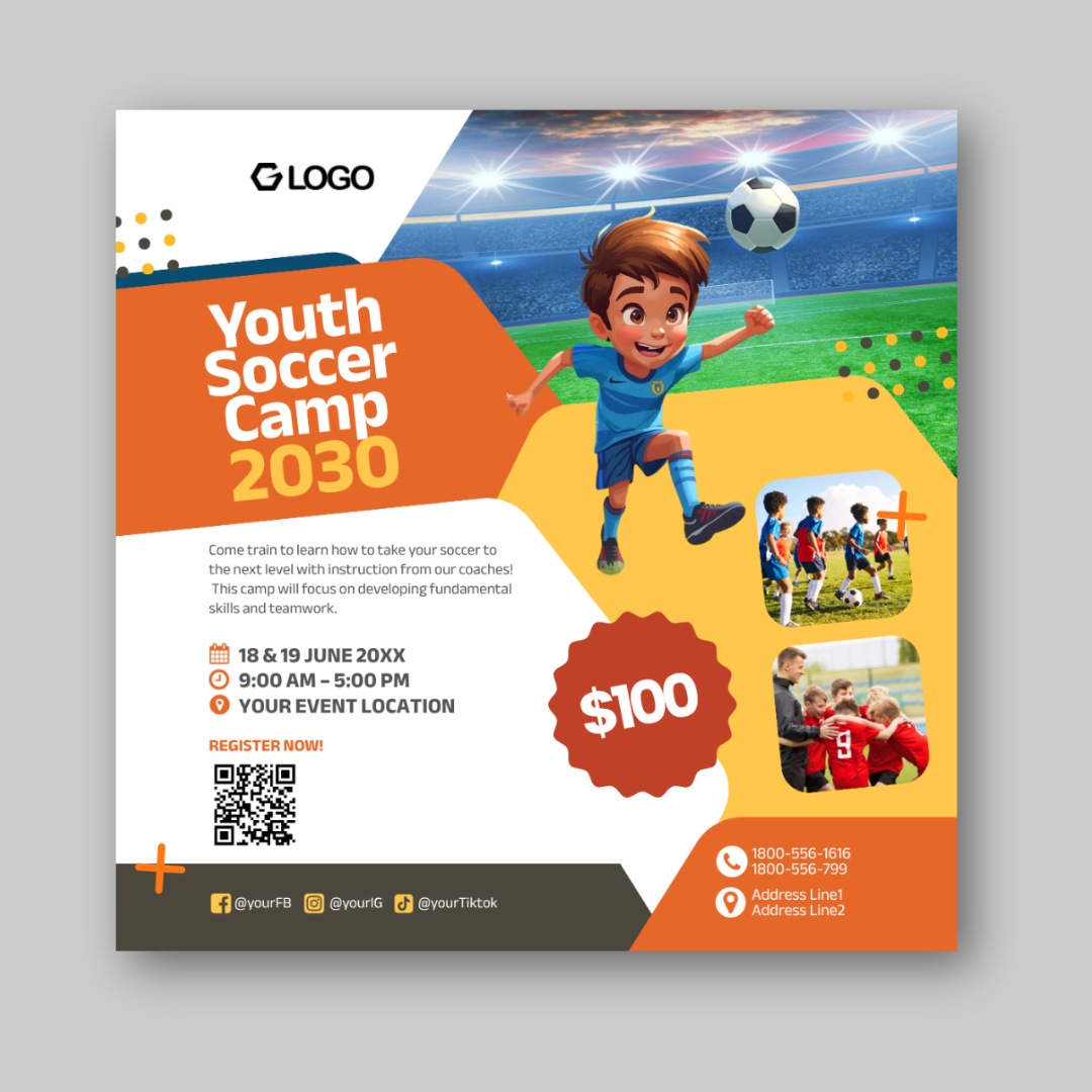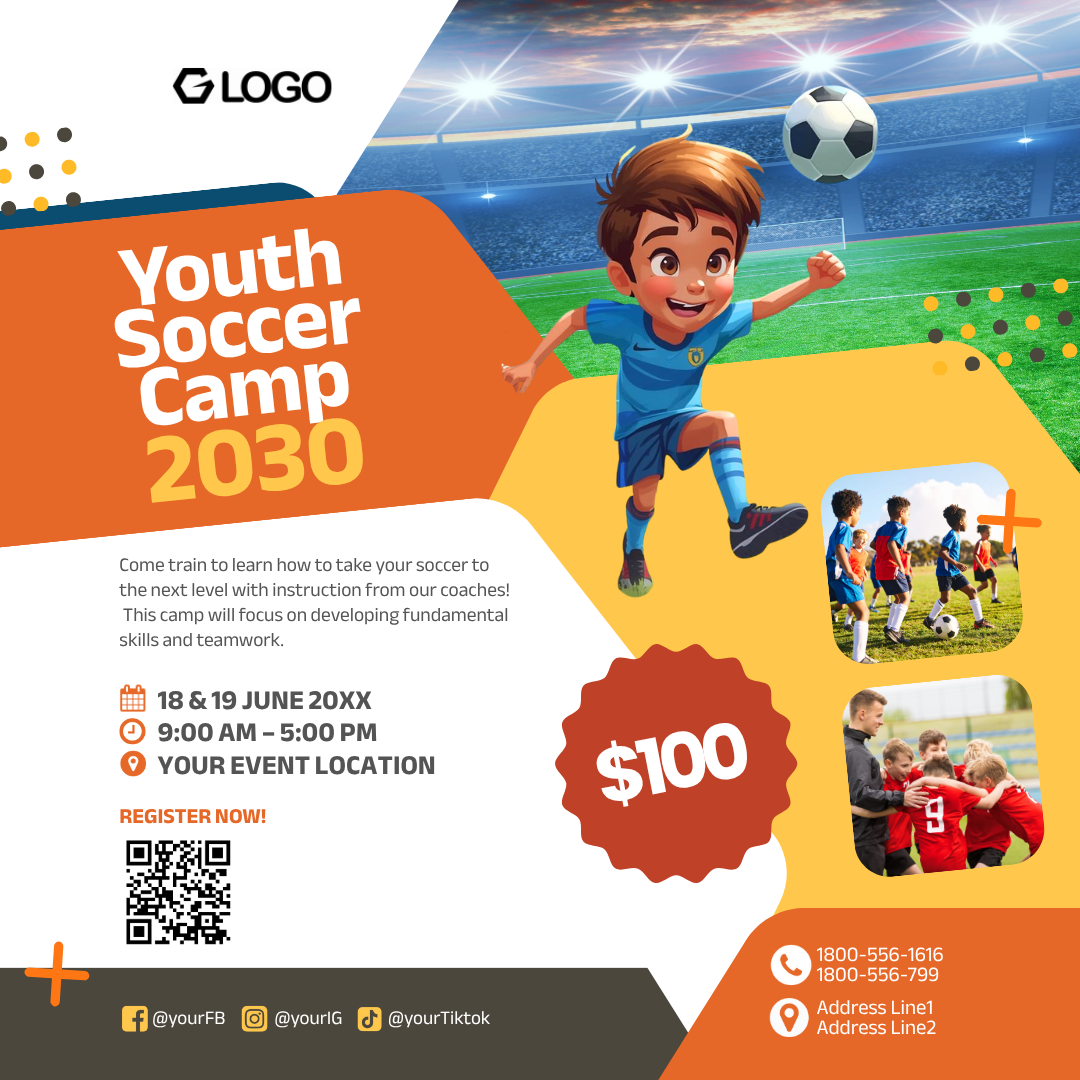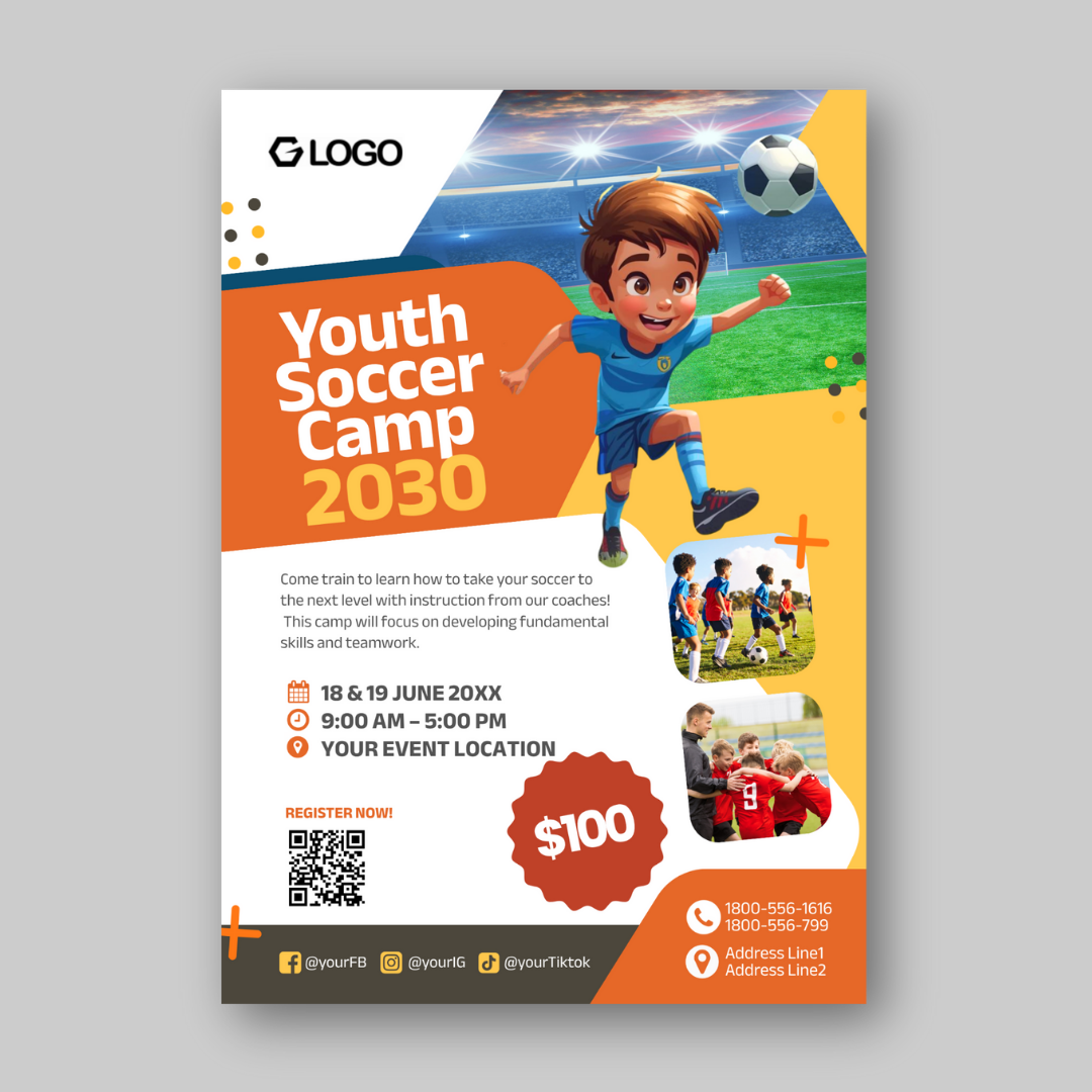 Create attention-grabbing sports promos with this fun and colorful Canva flyer designed specifically for children’s soccer and football camps.