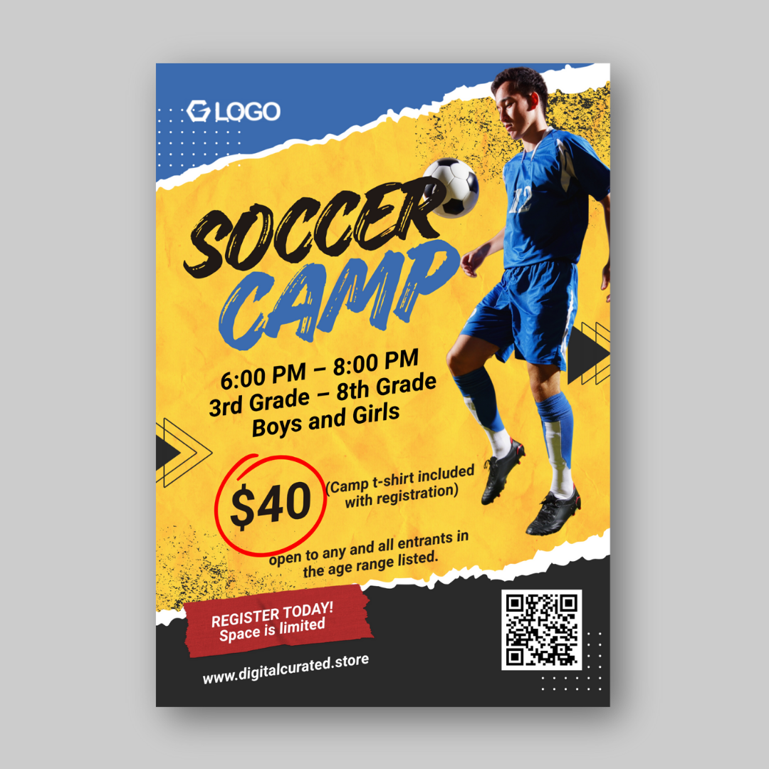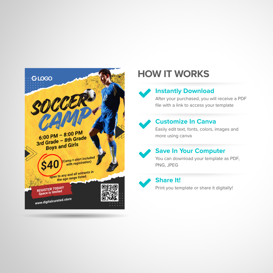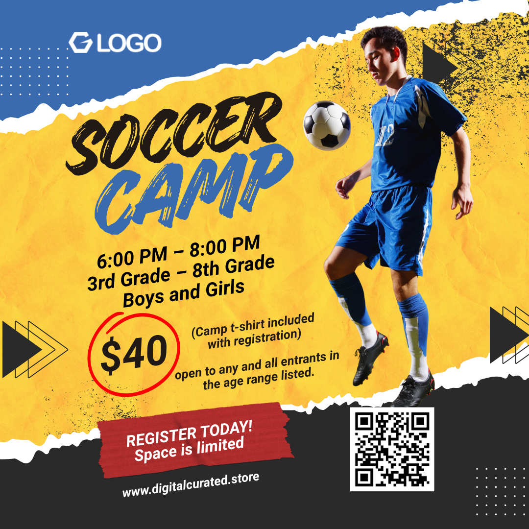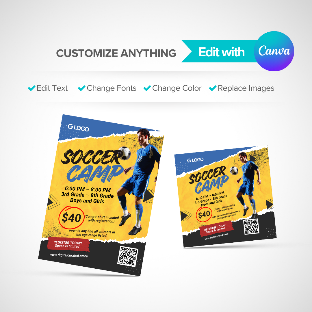 Promote your next soccer or football camp with this ready-to-use Canva template.