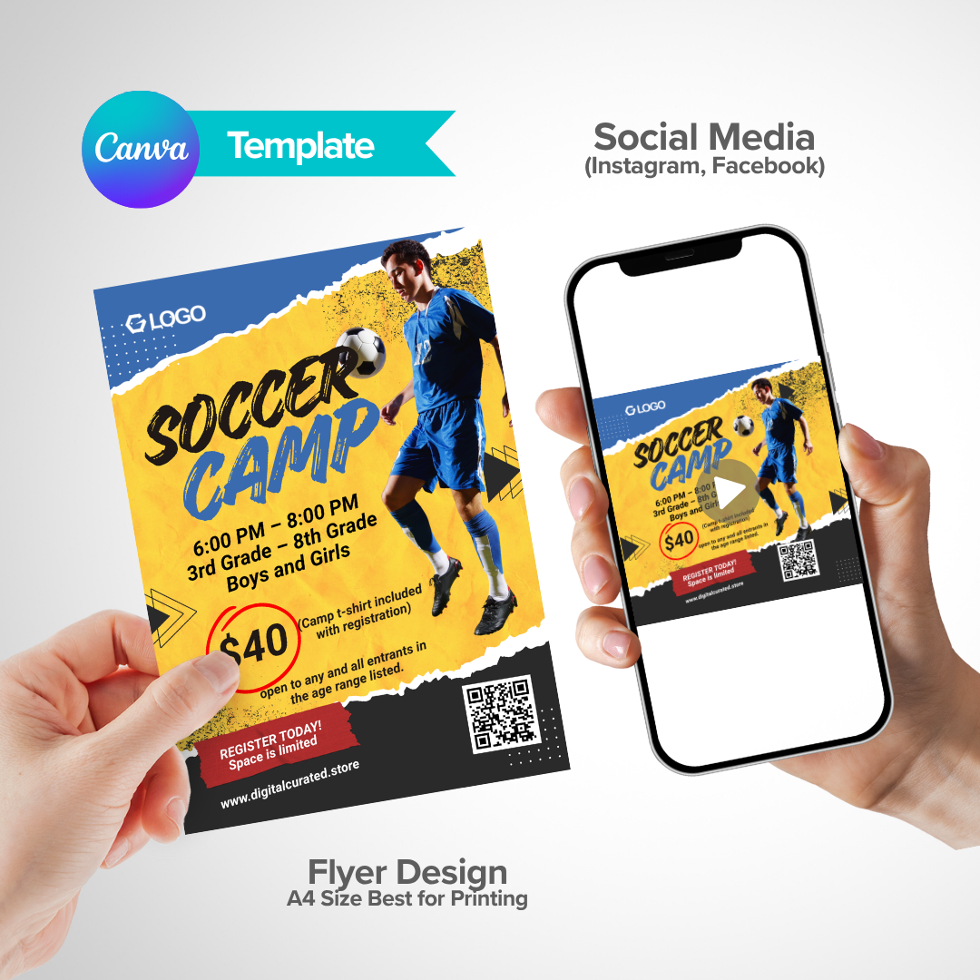 soccer flyer, football camp template, canva sports design, youth soccer training, football academy poster, sports promotion flyer, futsal event design, football camp ad, kids sports template, canva editable flyer, soccer marketing design, youth football event, sports social media post
